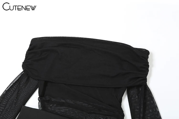 Dare to impress with this sleek and sultry maxi dress that perfectly blends elegance and allure. Featuring an off-shoulder neckline and long sheer mesh sleeves, this dress stands out with its sheer waist and torso paneling, adding a bold yet sophisticated touch. The figure-hugging silhouette flows into a floor-length hem, making it ideal for upscale dinners, cocktail parties, and glamorous night events.